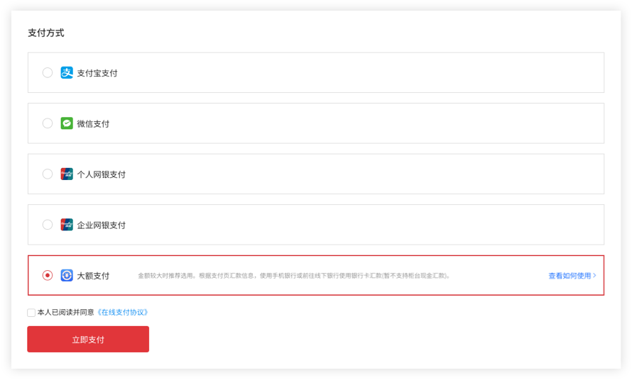 1、选择【大额支付】方式,点击立即支付。